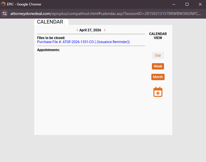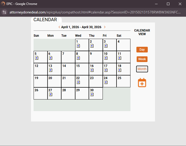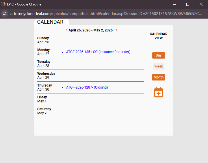 In the "Week" view, any important items that are due during the week will appear. You can quickly navigate to the file by clicking the hyperlink shown on that day's list. The day view works the same, except it only shows item for the selected day. Use the Date navigation at the top of the calendar to go back or advance forward in the days or weeks (based on the calendar view selected. The Month view works a little differently.