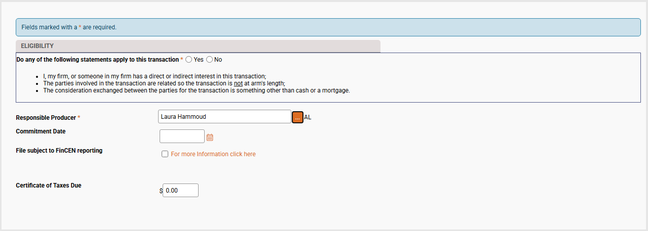 If you are in a state where it is necessary to obtain a Certificate of Taxes (such as Colorado) and have filed a rate for this, enter the amount to charge for the certificate of taxes. You can have this pre-populate for you by updating that rate field in the Firm Settings screen. That will be covered in a different section.