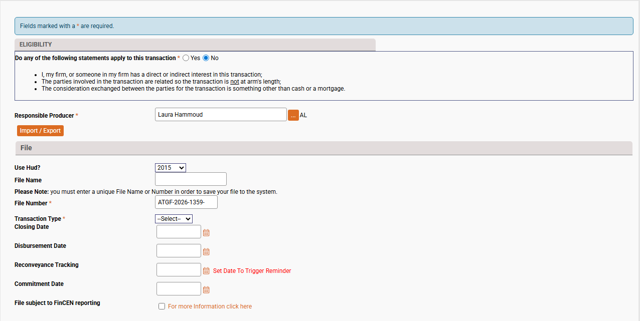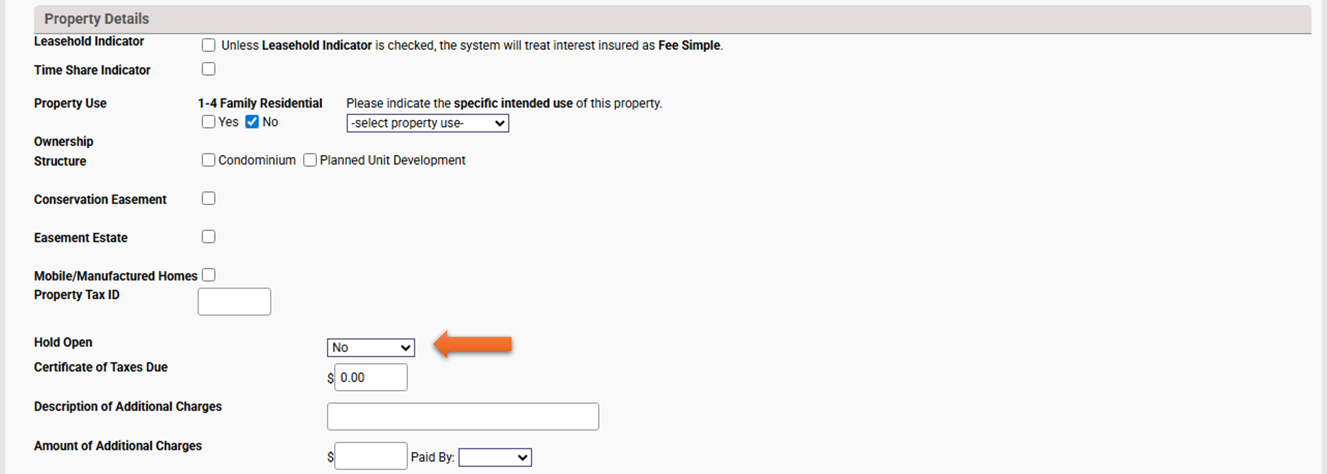 This option will only appear on purchase files and only if ATGF has filed a Hold-Open rate in the specific state. Select either foreclosure or investment based on whether the insured obtained the property from a foreclosure or as an investment with the intention of reselling.