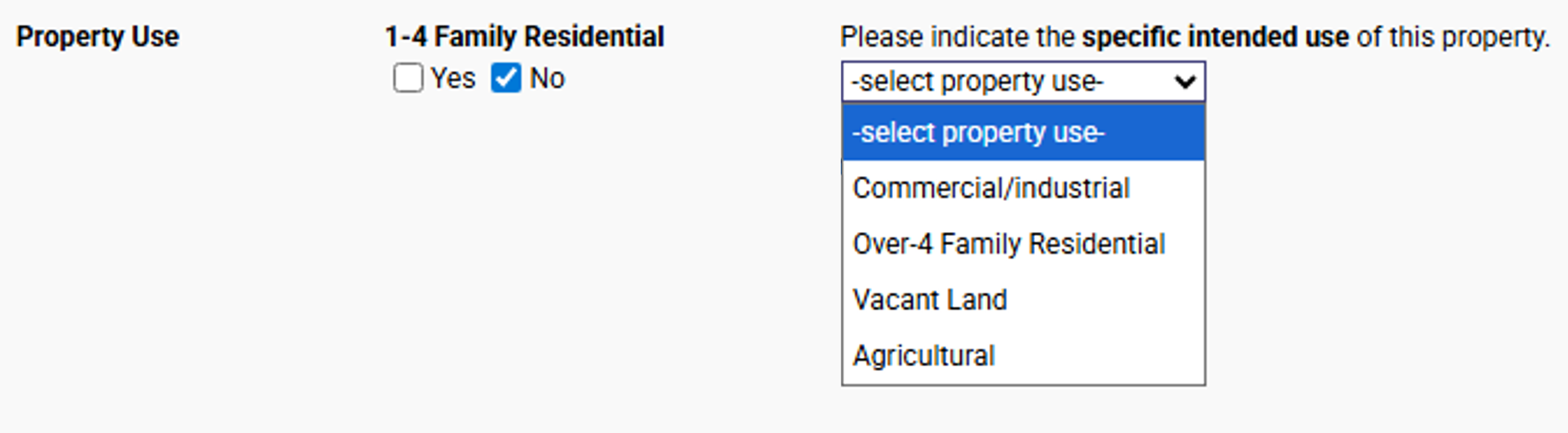 Here you will select the property use type at the time of closing, not the intended use. To change from 1-4 Family Residential to another property type, select the "No" check box. This will trigger a message to select a property use type. Acknowledge the message and select the correct option from the list in the drop-down.