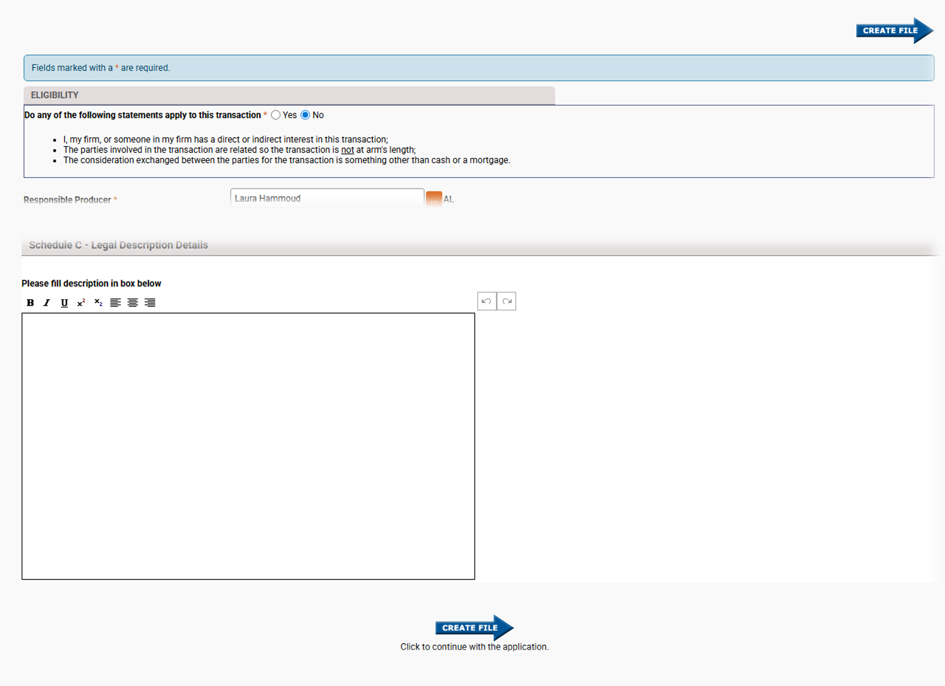 This section collects additional information about the property. Review and select all the appropriate options. Once the file is created, this section will move to a new screen that is accesed differently. Selecting the correct information now will prevent something from being overlooked later.
