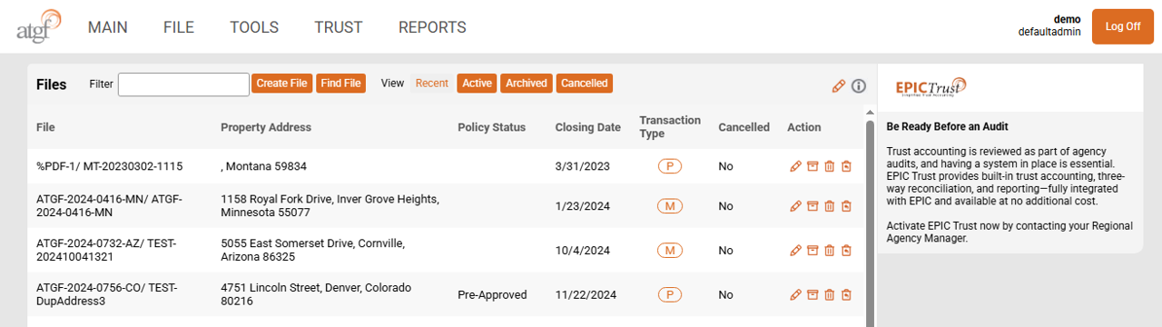 This lists all of the trust accounts currently linked to EPIC Trust. If you need to add a new trust account, reach out to the regional agency manager for your area or underwriting as these accounts will be setup for you through IT.